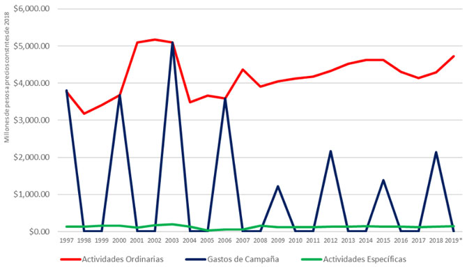 Como se puede apreciar, los recursos públicos entregados para actividades electorales, desde la reforma de 2007-2008, se ha reducido de manera importante, si se compara con años anteriores; no obstante, el financiamiento que se entrega para sostener actividades ordinarias no se ha reducido, a pesar de que el criterio para calcularlo ha cambiado.