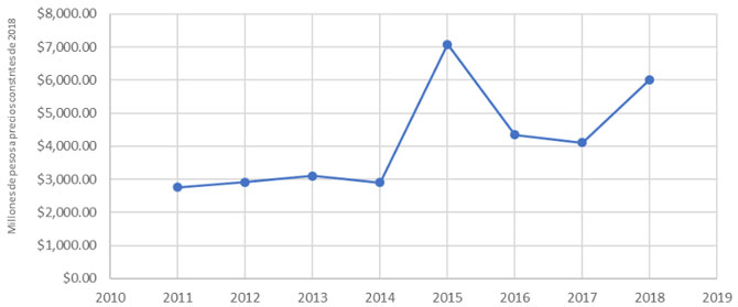 Gráfica 2. Financiamiento público de los partidos políticos a nivel local (2011-2018)