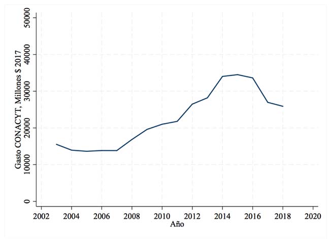 Notas: Creada por el autor con datos de CONACYT. Pesos constantes de 2017.