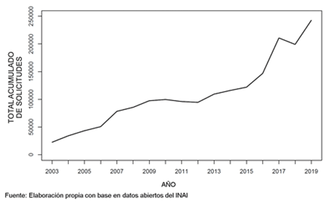 Es innegable que el derecho de acceso a la información se ha consolidado y que los mexicanos usan cada vez más este sistema. Como señala la gráfica 1, el número de solicitudes ha aumentado de 22 573 en 2003 —el primer año entero de funcionamiento del sistema— a 242 663 en 2019.