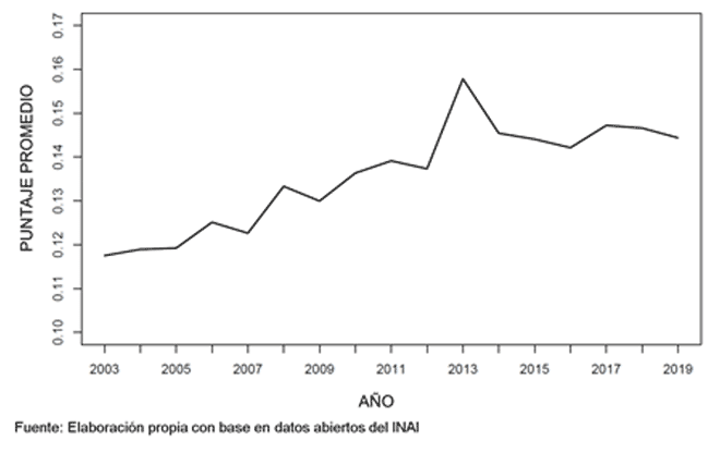 Nuestra evidencia sugiere un creciente dominio del sistema mexicano de acceso a la información por parte de usuarios con mucho conocimiento. Desarrollamos un índice que refleja la presencia de estos tres tipos de lenguaje y aplicamos modelos de machine learning para calificar el nivel de conocimiento reflejado en cada solicitud de información. Como demuestra la gráfica 5, este índice ha aumentado en la historia del sistema.