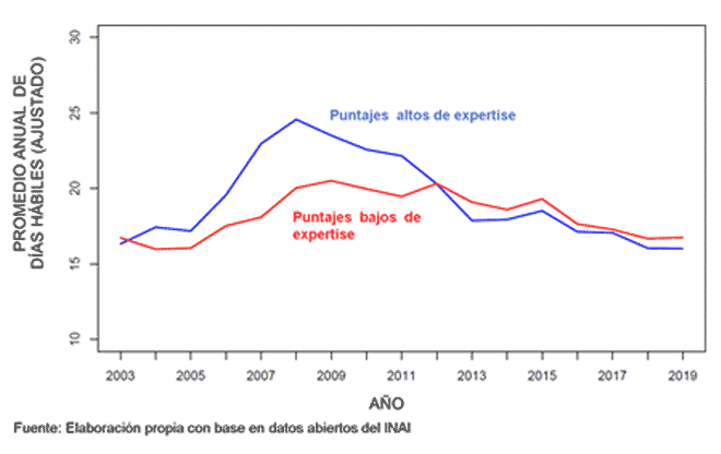 En los primeros ocho años del sistema, las solicitudes de los “no expertos” recibían, en promedio, respuestas más rápidas. Por ejemplo, en 2008, una solicitud con un índice de conocimiento alto tardaba casi 25 días hábiles para recibir respuesta, mientras que una solicitud con un índice bajo tardaba, en promedio, cinco días menos. Sin embargo, en los años siguientes, las dependencias mejoraron constantemente en su capacidad para contestar a las solicitudes de los “expertos”, mientras que la celeridad de sus respuestas a las solicitudes de los “no expertos” se estancaba. Desde 2012, las solicitudes de los “expertos” reciben respuestas más rápidas que las de los “no expertos”.