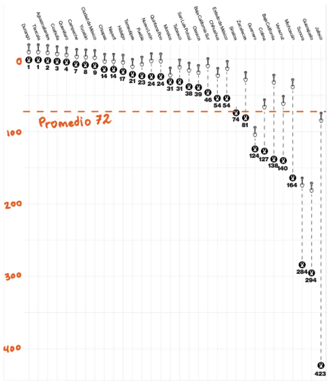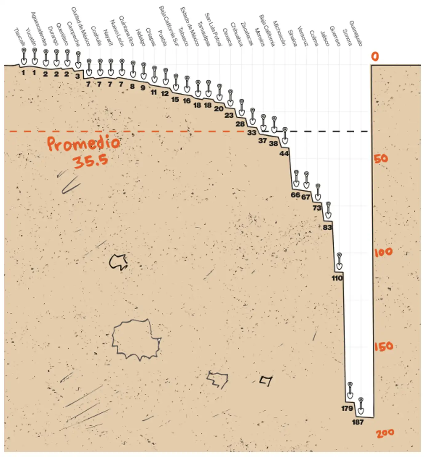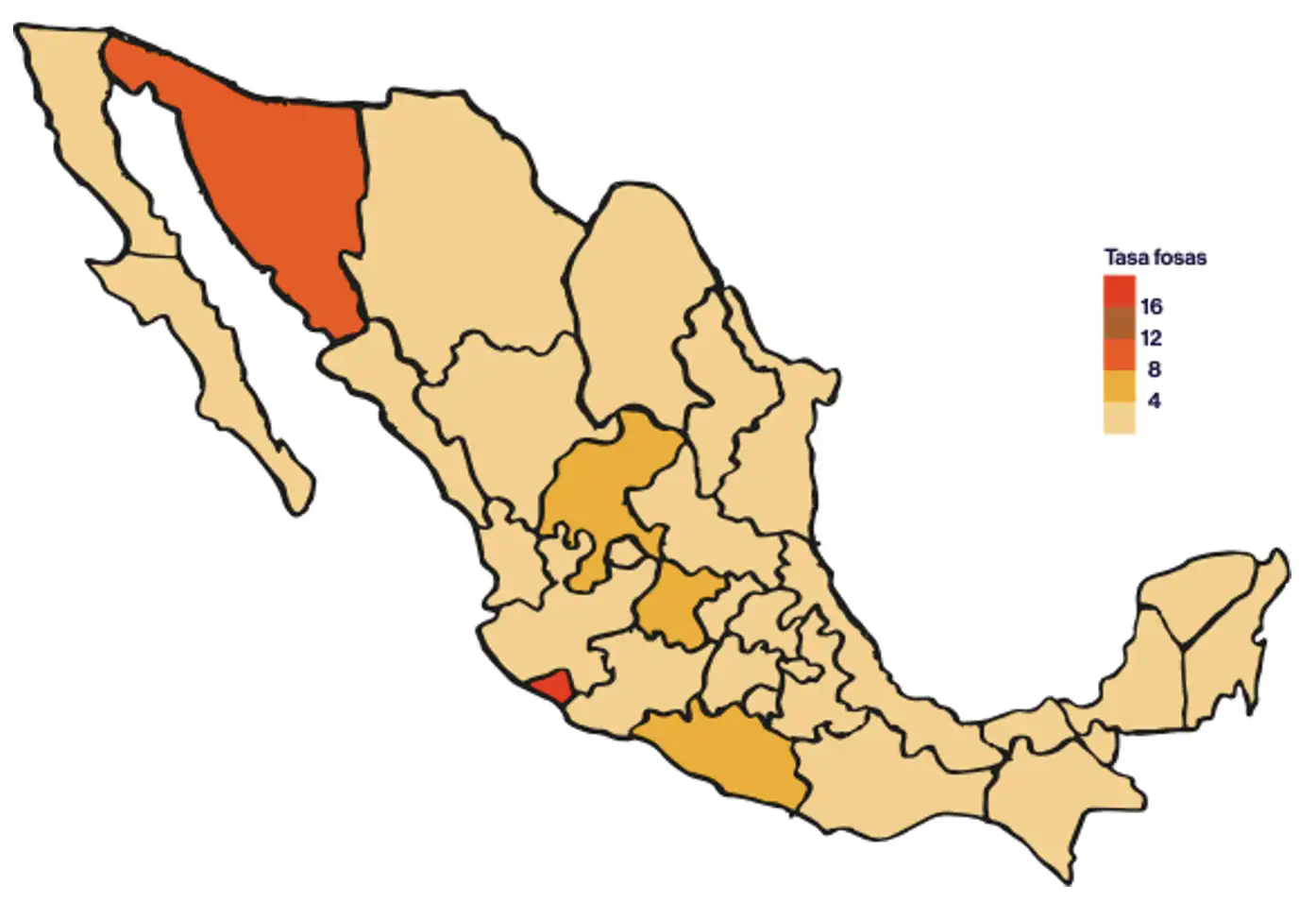 Al estudiar la tasa de fosas clandestinas documentadas en las 32 entidades del país, observamos que entre los estados con las tasas más altas por cada 100 000 habitantes se encuentran Colima, con diez fosas clandestinas; Sonora, con seis fosas; Guerrero y Guanajuato con tres fosas; Sinaloa y Zacatecas con dos fosas clandestinas.