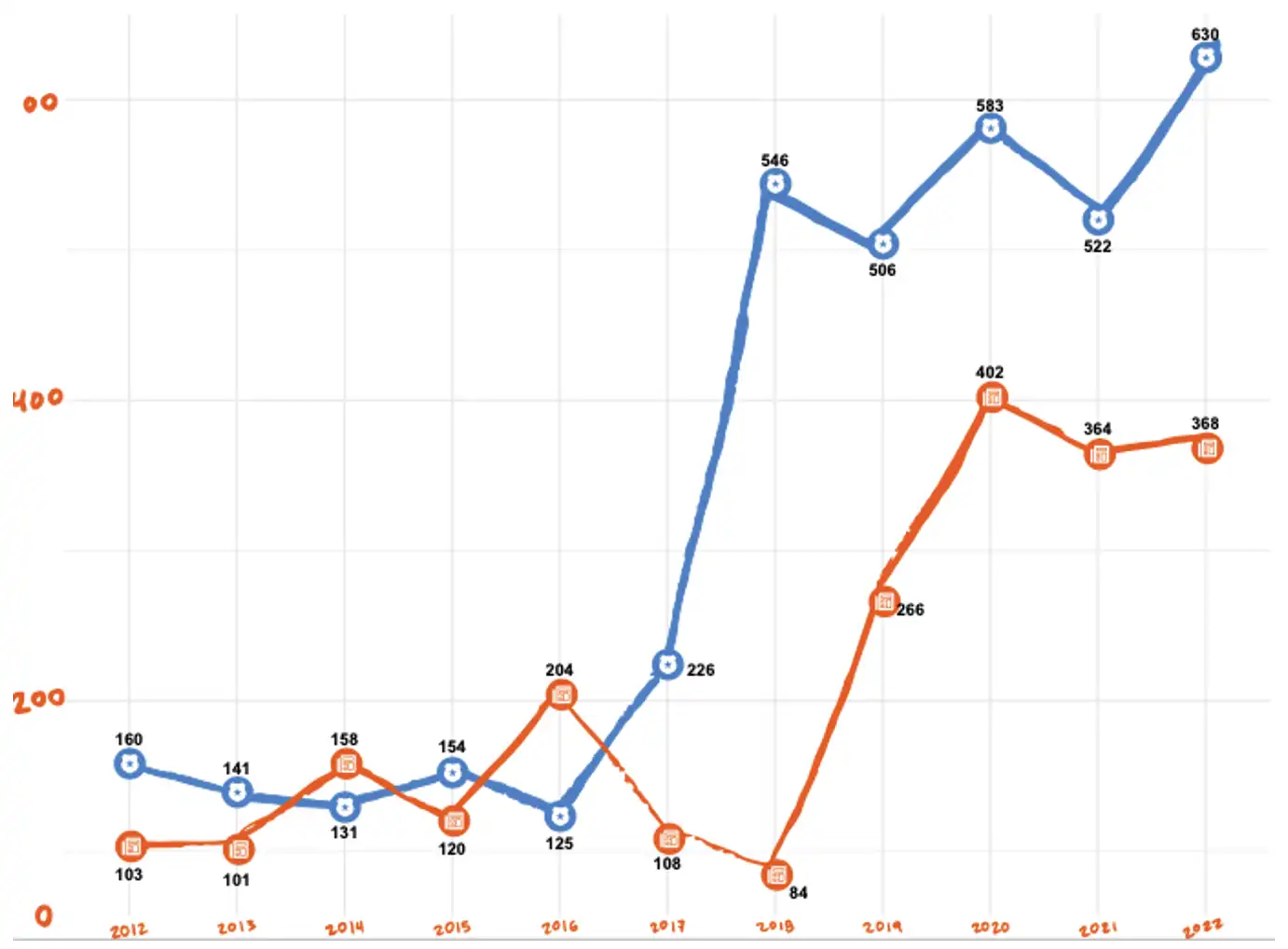 Al analizar la evolución de hallazgos de fosas clandestinas de 2012 a 2022, podemos observar el mismo patrón: las fiscalías reportaron más fosas clandestinas que los medios de comunicación, con 3724 y 2278 hallazgos, respectivamente. Asimismo, es posible apreciar que hay una tendencia al alza, lo que quiere decir que más fosas clandestinas se registraron con el paso de los años; 2022, 2020 y 2018 fueron los años con más registros.