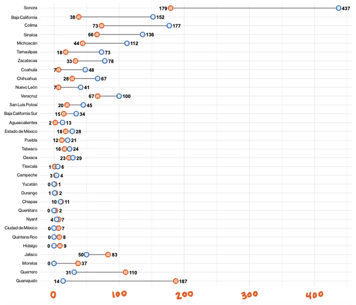 Hay casos en los que las fiscalías nos reportaron más hallazgos a nosotras que a la propia CNB: Sonora, Baja California, Coahuila, Puebla, Sinaloa, San Luis Potosí, Nuevo León, Estado de México, Aguascalientes, Tlaxcala. La diferencia entre los hallazgos reportados a la CNB y a nosotras al momento de escribir este artículo, siendo nuestros números más altos que los que proporciona la misma Comisión, es de 427, 99, 43, 19, 8, 8, 7, 3, 1 y 1 fosas, respectivamente.
