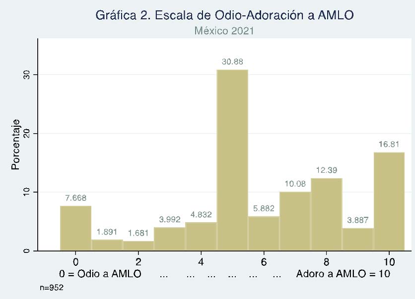 La Escala de Odio-Adoración (O-A) a AMLO se incluyó en una encuesta con representatividad nacional, levantada cara a cara en noviembre de 2021 por la casa encuestadora Data OPM. La Gráfica 2 muestra la distribución de los mexicanos en esta dimensión: