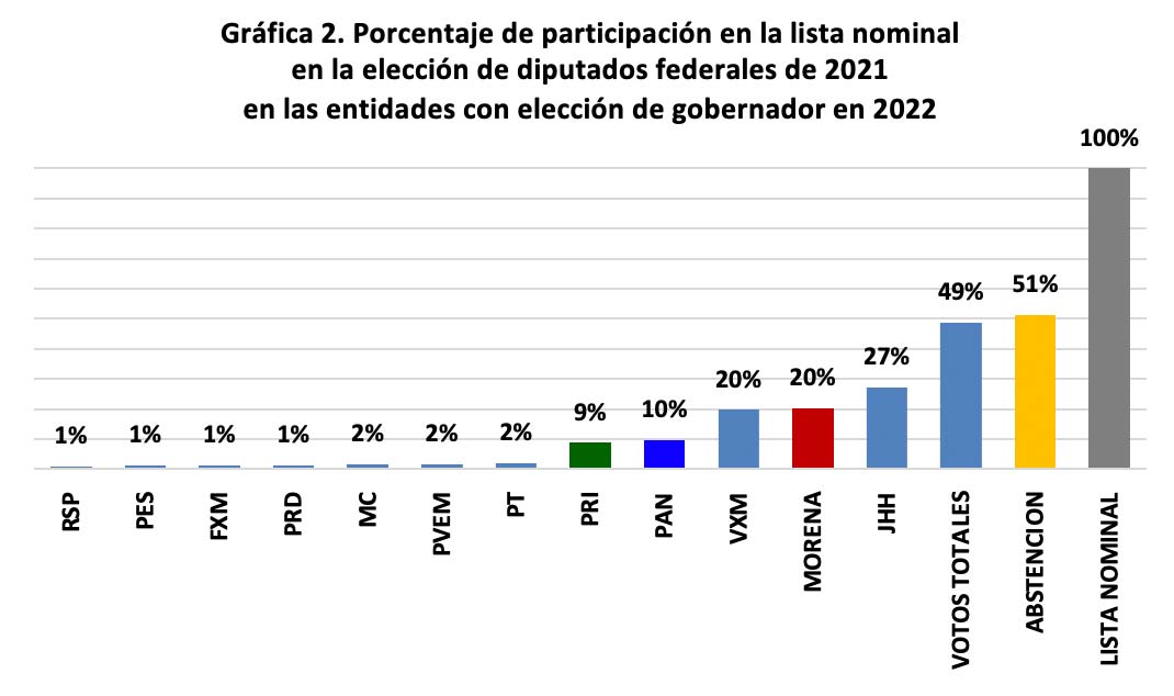 • Por su parte, la alianza Va por México (VXM), integrada por el PAN, el PRI y el PRD, tuvo niveles similares de participación en el grupo de entidades considerado y a nivel nacional, cercano en ambos casos a 20 % de las listas nominales.