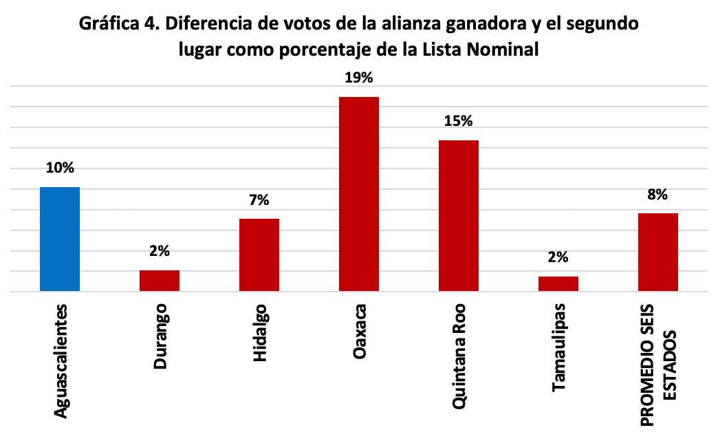 Del análisis de los votos obtenidos por las alianzas en las elecciones del año pasado en los estados que este año elegirán gobernadores, se puede concluir que serán contiendas muy reñidas en las que la participación ciudadana será decisiva. La alianza Va por México sólo obtuvo el triunfo en Aguascalientes, con dominancia de diez puntos; en tanto que Juntos Haremos Historia triunfó en el resto, con dominancia fuerte en Oaxaca y Quintana Roo, débil en Hidalgo y sin dominancia en Durango y Tamaulipas, como ilustra la gráfica 4.