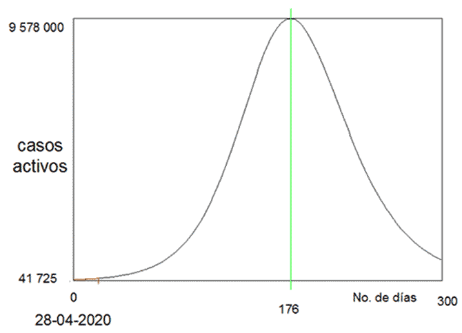 A partir de los datos del 18 de abril, el Dr. López-Gatell infirió que el final de la pandemia debería darse antes del 25 de junio, lo cuál fue un error más de su equipo. La lámina superior es copia de la mostrada durante la conferencia de ese día. En la lámina inferior mostramos una curva calculada por José Luis Marroquín (CIMAT, Guanajuato) que predice el fin de la pandemia para septiembre de este año.