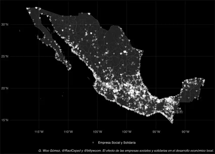 Localizamos a las ESS por medio del Directorio Estadístico Nacional de Unidades Económicas (DENUE) del Inegi. Filtramos todas las unidades económicas que tengan una razón social o un nombre relacionado con la economía social y solidaria. Por ejemplo, establecimientos que son “Sociedad cooperativa”, “Sociedad Financiera Comunitaria”, “Sociedad Cooperativa de ahorro”, entre otros, entran en nuestra categoría de ESS. No incluimos ejidos ni otros establecimientos que con alta probabilidad no son ESS (“Panadería la Unión”). Los datos están disponibles en Directorio de Empresas Sociales.