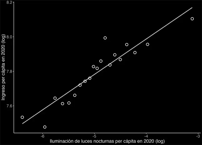 Fuente: Elaboración propia con base en datos de la muestra ampliada del Censo de Población y Vivienda 2020 y de Elvidge y coautores (2019). El eje horizontal representa la luminosidad nocturna per cápita promedio a nivel municipal para el año 2020 en escala logarítmica. El eje vertical representa el ingreso per cápita promedio a nivel municipal para el año 2020 en escala logarítmica. Cada punto representa el promedio por veintil de iluminación nocturna per cápita e ingreso per cápita.