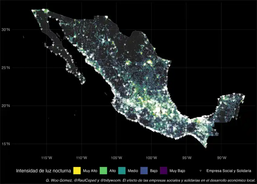 Fuente: Elaboración propia con base en datos de Elvidge y coautores (2019) y el DENUe. Cada punto representa una celda o pixel de aproximadamente 25 kilómetros cuadrados. La escala de colores corresponde a la intensidad de luz nocturna. Cada triángulo blanco en el mapa representa la ubicación exacta de una ESS.