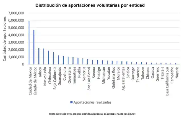 Entre 2018 y 2023, la Ciudad de México fue la entidad que registró más aportaciones voluntarias, seguida por el Estado de México; en tercer lugar, Jalisco y, en cuarto, Nuevo León. Un factor que podría explicar estos datos es que el Estado de México cerró 2023 como la entidad con mayor número de cuentas de Afore (aunque no necesariamente es el estado que más ahorra para el retiro). En el otro extremo, Baja California Sur y Campeche son las entidades en donde menos aportaciones se realizaron, lo que se puede explicar porque son de los estados que tienen menor número de cuentas de Afore.