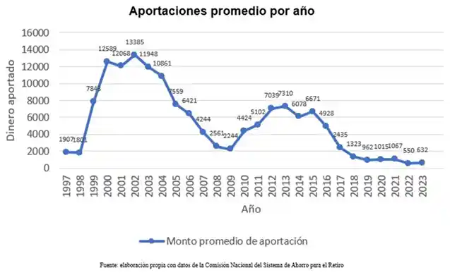 Desde 1997, cuando iniciaron las Afores, las aportaciones promedio por año fueron incrementado en los primeros años de manera gradual y tuvieron su pico en 2002 (con 13 385 pesos en promedio de aportaciones voluntarias anual por persona). Pero esta cifra fue decayendo en los años posteriores hasta 2009 (año de la crisis financiera); retomó la tendencia creciente en los siguientes años hasta 2015, cuando se observó una nueva desaceleración hasta 2022. Ese año el promedio de aportaciones voluntarias tocó el punto más bajo de la serie (en el inicio de la recuperación pospandemia) con 550 pesos en promedio.