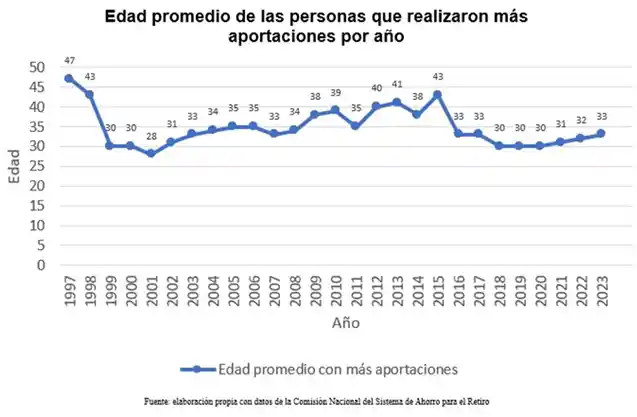 En cuanto a la edad promedio de las personas que realizan aportaciones voluntarias, en 1997 el promedio de edad era de 47 años; seguramente se debe a que las personas estaban transitando del régimen anterior de pensiones al nuevo régimen de cuentas individuales. Sin embargo, en los años posteriores, la edad promedio fue bajando. Podríamos interpretar este dato como positivo porque significa que cada vez más jóvenes ahorraban para su futuro. La edad promedio más baja de la serie se registró en 2001 con 28 años. En los más recientes registros anuales, el promedio de edad de personas que realizan una mayor cantidad de aportaciones voluntarias se ha mantenido entre los 30 y 33 años.