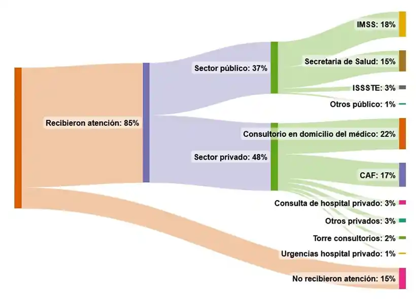 El 85 % de las personas con enfermedades reciben atención, pero sólo cuatro de cada diez son atendidas en servicios públicos. De este porcentaje, el 37 % se atendió en el sector público: el Instituto Mexicano del Seguro Social (IMSS), la Secretaría de Salud, el Instituto de Seguridad, Servicios Sociales de los Trabajadores del Estado (ISSSTE) y otros servicios públicos. El 22 % de los pacientes asistió a un consultorio privado, el 17 % fue a una clínica de atención familiar (CAF), el 3 % estuvo en un hospital privado, el 2 % se atendió en una torre de consultorios y el 1 % recibió atención en urgencias de un hospital privado.