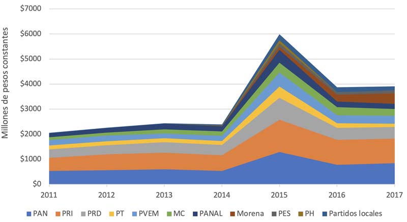 Sexto, es cierto que hay un rubro donde sí ha crecido el gasto electoral: en las prerrogativas de los partidos políticos nacionales en elecciones locales. La gráfica 5 lo deja claro. En 2015, después de la reforma electoral de 2013, los partidos políticos incrementaron su gasto en campañas. Es decir, parte importante del gasto federal destinado a elecciones federales se fue al ámbito local, y este gastó sale de las tesorerías de los gobiernos locales.