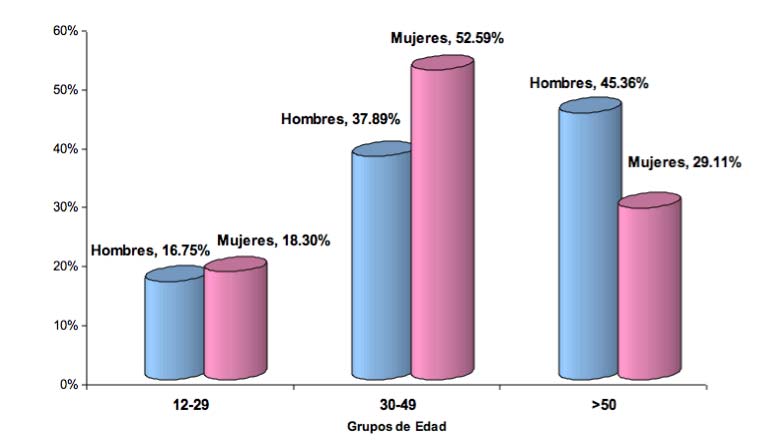 Por grupos de edad, se observa que los hombres se concentran en el rango de mayor a 50 años. Por su parte, el 52.59% de las mujeres se encuentra en el grupo de 30 a 49 años.