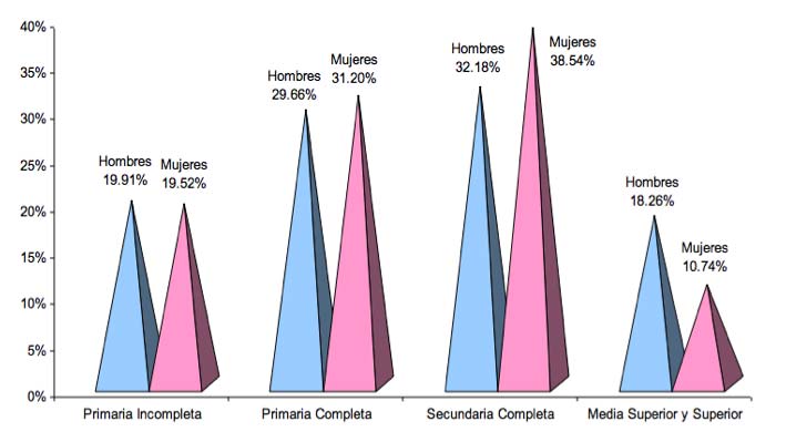 Las mujeres que se ocupan en el trabajo doméstico tienen en general un menor nivel educativo que los hombres. El 38.5% de las mujeres concluyeron la secundaria y únicamente el 10.7% tienen estudios de nivel medio y superior. En contraparte, el 18.2% de los hombres concluyeron la preparatoria y cursaron alguna licenciatura o ingeniería.