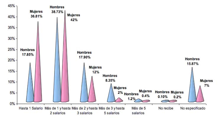El sesgo en el nivel educativo se refleja en el nivel de percepciones. Mientras que 8.35% de los hombres se encuentran en el rango de ingresos de más de tres hasta cinco salarios, únicamente el 2% de las mujeres se encuentran en este nivel. El porcentaje de mujeres que no reciben más de un salario como contraprestación es más del doble de la proporción de hombres que perciben hasta un salario.