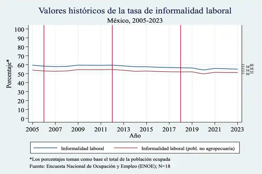 Hace seis años, al final del gobierno del presidente Enrique Peña Nieto, publicamos en nexos “El empleo informal y la precariedad laboral en México en los últimos cuatro sexenios (1995-2017)”. En ese trabajo examinamos la validez de la propaganda de esa administración, que se vanagloriaba de haber generado más empleos formales que todas las administraciones anteriores y que, por lo tanto, el de Peña Nieto merecía el título del “Sexenio del Empleo”.