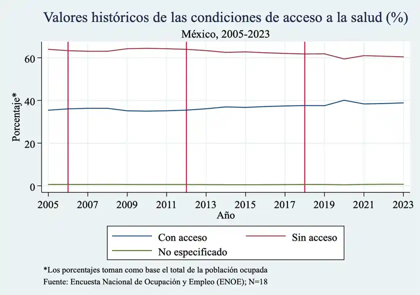 Como puede claramente apreciarse en las cinco gráficas siguientes, durante el sexenio de la 4T no se registró ninguna diferencia significativa en el nivel del empleo informal o en las condiciones de acceso al Seguro Social y a la salud en comparación con los sexenios anteriores. De hecho, si tomamos en cuenta la desaparición del Seguro Popular, es razonable afirmar que los servicios de salud relevantes para los trabajadores y las trabajadoras informales han sido impactados de manera particularmente negativa en el sexenio del presidente López Obrador.