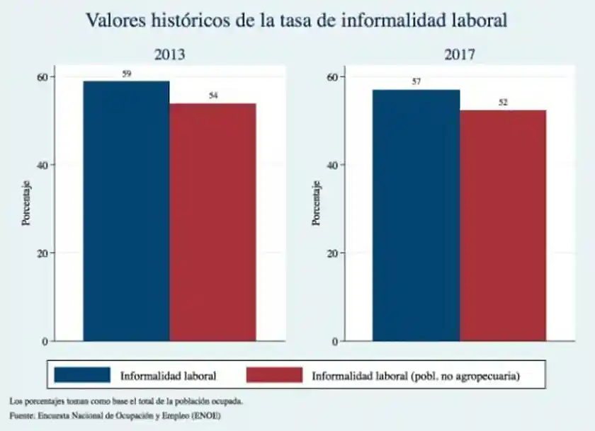 La definición de empleo informal utilizada en nuestro artículo sobre el desempeño de la administración anterior, y también para el caso de la presente, refiere a las trabajadoras y los trabajadores informales como aquellos que no gozan de seguro de salud (y otros beneficios sociales) asociados directamente a su empleo. La medición del Inegi que utilizamos entonces —y también ahora— se realiza a través del número y porcentaje de trabajadores no afiliados al Seguro Social (IMSS e ISSSTE).