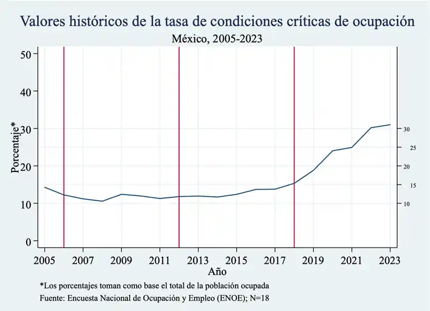 Finalmente, para valorar el impacto real de la administración de la 4T sobre los trabajadores y las trabajadoras mexicanas, vale la pena presentar los datos incluídos en lo que el Inegi llama la “tasa de condiciones críticas de la ocupación”, que refiere al “porcentaje de la población ocupada que representan los ocupados que se encuentran trabajando menos 35 horas a la semana por razones de mercado, los que trabajan más de 35 horas semanales con ingresos mensuales hasta de un salario mínimo, y los que trabajan más de 48 horas semanales por más de uno y hasta dos salarios mínimos”. La tabla refleja que el sexenio de la 4T ha sido el peor de las tres últimas administraciones en términos de esa tasa.