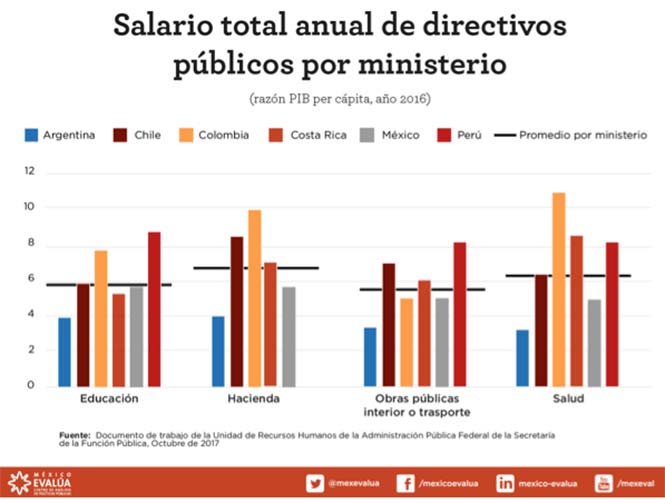 Una situación similar se observa a partir del comparativo entre salarios de directivos en distintos ministerios de la administración pública. Los resultados arrojan que los sueldos de los funcionarios mexicanos son inferiores en promedio a otros países en América Latina.