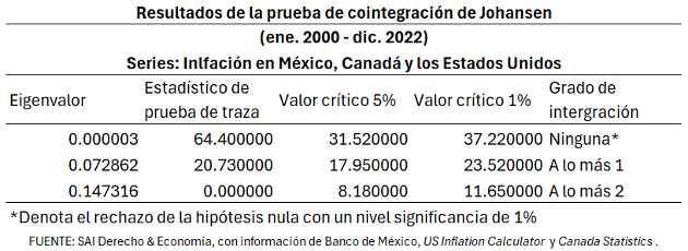 El desvanecimiento de asimetrías comerciales y el programa de desgravación arancelaria del TLCAN no sólo detonaron la inversión y el comercio; también catalizaron la convergencia de variables macroeconómicas, como lo demuestran los resultados de ciertas pruebas estadísticas, en particular la de cointegración de Johansen (ver anexo).[5] La prueba aplicada a los índices de producción industrial de México y Estados Unidos entre 1980 y 1993 resulta en la aceptación de la hipótesis nula (no hay cointegración), pero en su rechazo para el período entre 1994 y 2023 (las variables sí están cointegradas). Similarmente, la hipótesis nula se rechaza a partir de 1994 para las series de inflación, tasas de interés de corto plazo y volatilidad de las monedas mexicana y canadiense con respecto a la estadunidense. En su conjunto, los resultados de las pruebas de cointegración confirman la simbiosis macroeconómica que el TLCAN detonó.