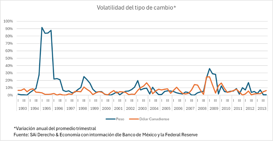 Volatilidad de MXN y CAD vs USD 1997-2023