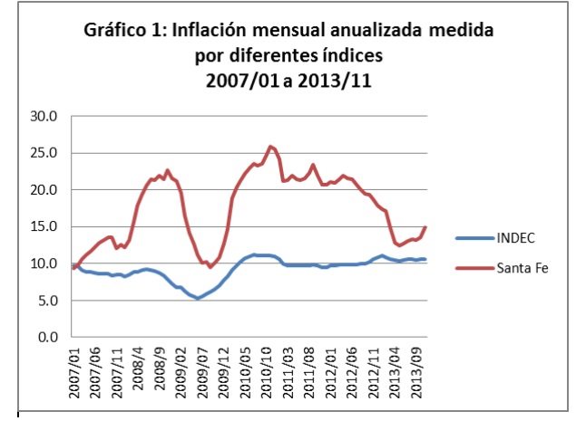 [3] El índice de precios alternativo para calcular la inflación fue el elaborado por el Instituto Provincial de Estadísticas y Censos de Santa Fe, que hasta antes de la intervención en el INDEC exhibía una fuerte correlación con el índice calculado por la institución nacional.