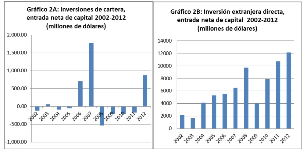 Por otra parte, al subestimarse la inflación, el ajuste de los instrumentos financieros indizados a la misma ha sido menor al que tendría que haberse dado; sobre todo porque las tasas de inflación han superado el 10% anualizado en fechas recientes de acuerdo con el dato oficial. Sin embargo, como se puede apreciar en el gráfico 1, los índices de precios alternativos muestran que la inflación superó el 10% desde 2007[3]. Entonces, es posible notar que las inversiones extranjeras en cartera (activos financieros) cesaron de 2007 a 2011, recuperándose un poco en 2012. Por su parte, si bien la inversión extranjera directa ha seguido creciendo, es notorio que los incrementos son menores a partir de 2010 (Gráfico 2).