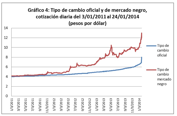 Ante las menores entradas de dólares, el gobierno argentino respondió restringiendo el acceso de la población a las divisas mediante medidas administrativas, las cuales iban desde prohibir la compra de dólares por motivo de atesoramiento (coloquialmente, para guardarlos bajo el colchón) a limitar el acceso de dólares por parte de los turistas argentinos en otros países mediante sus tarjetas de crédito. Estas restricciones llevaron al surgimiento de un mercado de dólares paralelo al oficial. Como se puede ver en la gráfica 4, la divergencia entre el tipo de cambio oficial y el tipo de cambio del mercado negro es sustancial, reflejando que la demanda de dólares no ha disminuido con los controles.