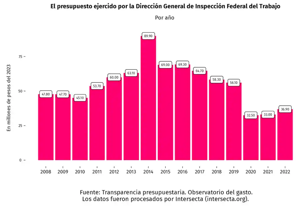 Lo anterior resulta consistente al echar un vistazo al presupuesto ejercido por la Dirección General de Inspección Federal del Trabajo. Según Transparencia Presupuestaria, este se redujo casi en un 80 % durante el sexenio que concluye. Mientras que durante los seis años de la presidencia de Enrique Peña Nieto (2013-2018), el promedio anual de presupuesto ejercido por la Dirección era de 69 millones de pesos (en pesos de 2023), durante los cuatro años de la presidencia de Andrés Manuel López Obrador para los cuales hay datos, el promedio de presupuesto ejercido ha sido de 39 millones de pesos.