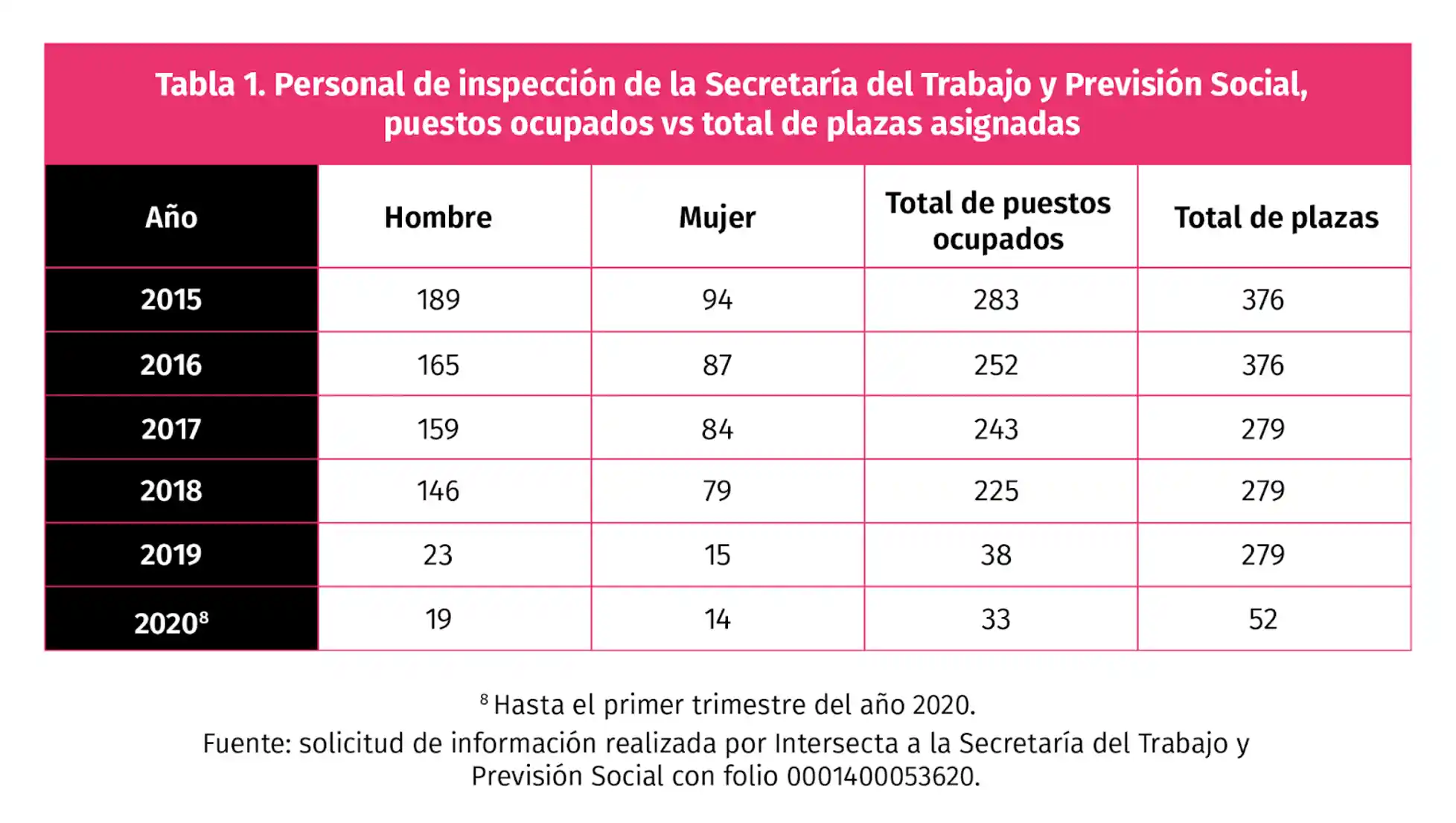 Según datos obtenidos a través de solicitudes de información realizadas a la Secretaría del Trabajo y Previsión Social por Intersecta en el año 2020, la cantidad de inspecciones del trabajo que la autoridad laboral realiza cada año se ha reducido de forma drástica a partir de 2019. Mientras que en el año 2015 la autoridad informó haber realizado un total de 128 864 inspecciones a centros de trabajo, para el año 2019 solo reportó 31 231 inspecciones. Es decir, las inspecciones que la autoridad laboral realiza cada año cayeron 70 % durante la última administración.