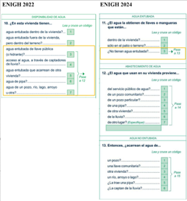 Figura 1. Cambios en las preguntas en la ENIGH 2022 y 2024 y modificación de los criterios de estimación de carencia por acceso al agua (recuadro amarillo).