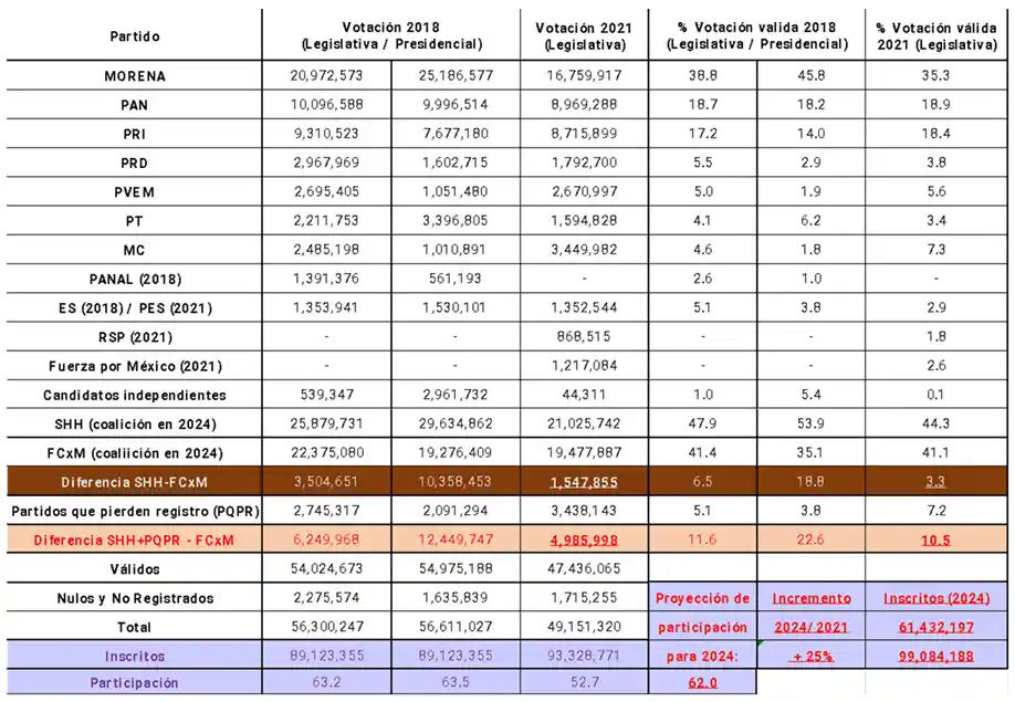 Muchos analistas deducen de estas cifras que la actual contienda por la Presidencia resultará de lo más reñida entre Claudia Scheinbaum y Xóchitl Gálvez, dado que la diferencia en los resultados que obtuvieron las dos coaliciones que las apoyan ahora en las legislativas de 2021 fue de tan sólo 3.2 puntos porcentuales. Sin embargo, se olvidan del 7.2 % de los votos que obtuvieron ese año los tres partidos que perdieron su registro federal —PES, FxM y RSP—, que se declararon abiertamente partidarios del presidente López Obrador.
