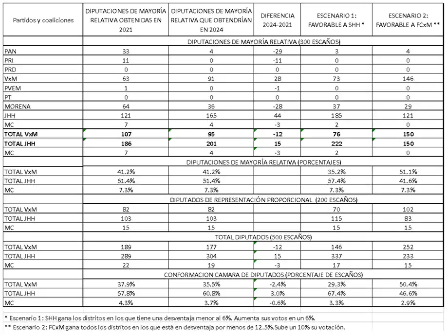 Una incógnita del próximo 2 de junio reside en el resultado de las elecciones para diputados, que podría dotar a la presidenta de una mayoría legislativa o, por el contrario, dar lugar a un gobierno dividido. Si se repitiesen los resultados de 2021, SHH seguramente saldría beneficiada por la desaparición de los tres partidos que perdieron su registro. Éstos se declararon seguidores de López Obrador, pero, como eran partidos de nueva creación, la ley prohibía que se integraran a alguna coalición. En 2021, JHH ganó en 186 distritos. De haber podido contar con los votos de los tres partidos afines a la 4T, hubiera obtenido 15 escaños uninominales más. Si los ciudadanos repitieran sus votos en 2024, SHH ganaría 201 diputaciones de mayoría relativa, FCxM 95 y MC 4. Proyectando los 200 escaños de representación proporcional, SHH alcanzaría un total de 304 diputados (un 60.8 % del total), FCxM tendría tan sólo 177 (35.5 %) y MC obtendría 19 (3.7 %).