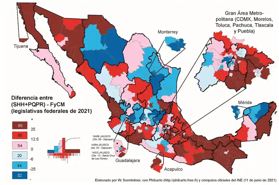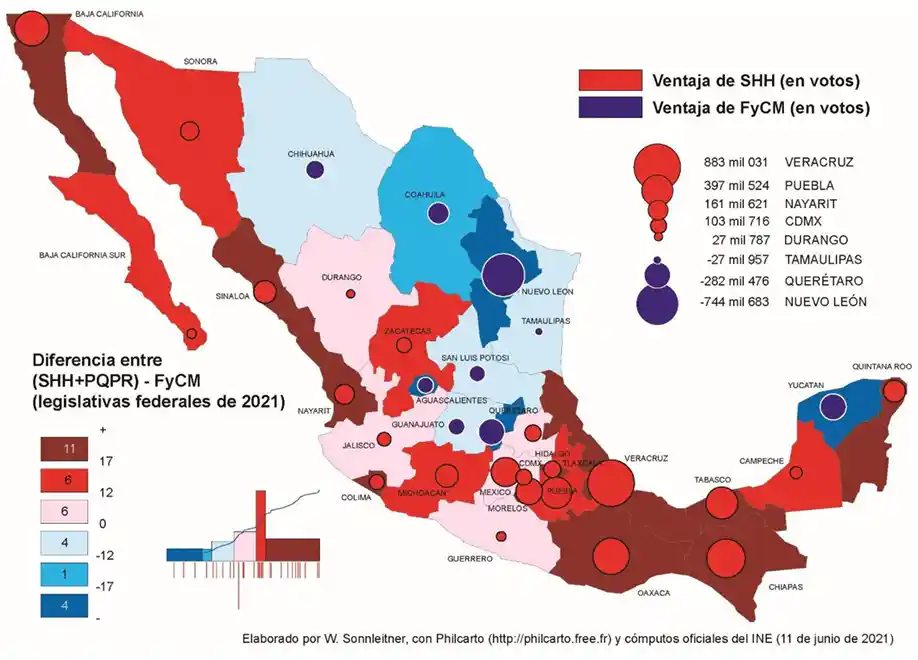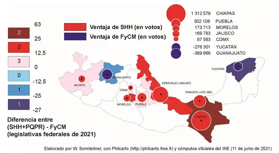 Como resultado de la polarización geográfica del voto, la diferencia de votos a nivel de los estados federales entre los votos que recibió la 4T y la coalición opositora es casi siempre muy grande. Sólo en ocho de ellos fue menor al 12 %. En Tamaulipas (+2.0 %) y en San Luis Potosí (+9.3 %), la ventaja inicial la tiene FCxM ya que, sorprendentemente, en esos dos estados Morena compite ahora en solitario. En Chihuahua, la ventaja potencial de los candidatos a senadores de la oposición es de 11.2 puntos.