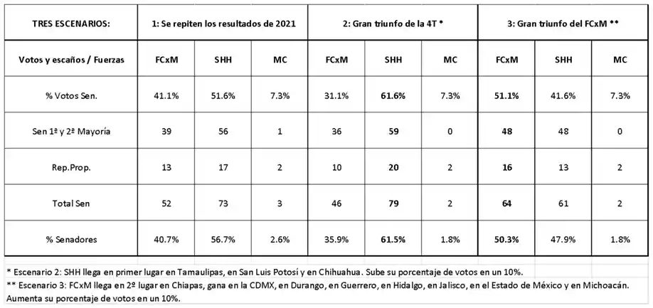 Si bien la coalición oficialista puede fácilmente renovar su mayoría absoluta en el Senado, le es prácticamente imposible, en cambio, conseguir la mayoría calificada (86 de 128 escaños). En efecto, las reglas del reparto de las curules hacen que dicha meta sea casi imposible de alcanzar para cualquier partido o coalición que se presente unida en los 32 estados. Para ello, tendrían que llegar en primer lugar en todos los estados de la República (64 senadores) y obtener el 68.75 % del voto (22 senadores de representación proporcional). Por cada estado en el que sólo alcanzasen la segunda posición, requerirían aumentar su porcentaje de voto en un 3.125 %. Por ello, para unos partidos que son aliados, una mejor estrategia es ir por separado en los estados en los que puedan lograr el primero y el segundo lugar. De hecho, SHH sólo presenta candidaturas comunes en 20 estados. Pero sólo en Chiapas se antoja factible que dos de los partidos de la 4T logren el primer y segundo lugar, aunque la ventaja del PVEM sobre FCxM en 2021 fue de sólo 1.9 puntos. En el caso en que los partidos fieles a la 4T fuesen los más votados en todos los estados en los que aventajan (según los resultados de 2021), lograsen triunfar en Tamaulipas (desventaja de 2 puntos), en San Luis Potosí (desventaja de 9.3) y en Chihuahua (desventaja de 11.2) e incrementaran su caudal en diez puntos para obtener el 61.6 % de los votos válidos, sólo alcanzarían 79 senadores (el 61.5 % del total). Los demás estados parecen fuera de su alcance, ya que en ellos FCxM cuenta con una ventaja mayor a 20 puntos porcentuales.