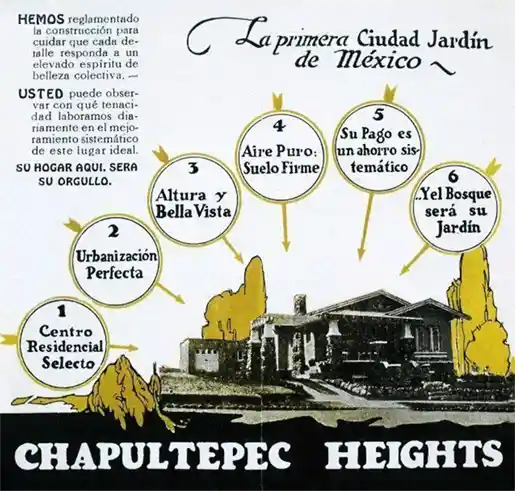 En el caso de Chapultepec Heights lo único que se tomó de los preceptos iniciales de Howard fue la idea de construir casas con jardín y vialidades de un trazo orgánico. Sin embargo, la publicidad se encargó de promocionar la nueva colonia como un centro residencial selecto, con aire puro, suelo firme y un elevado espíritu de la belleza colectiva en el que se podía tener una casa campirana con las ventajas de vivir en la ciudad.