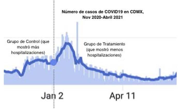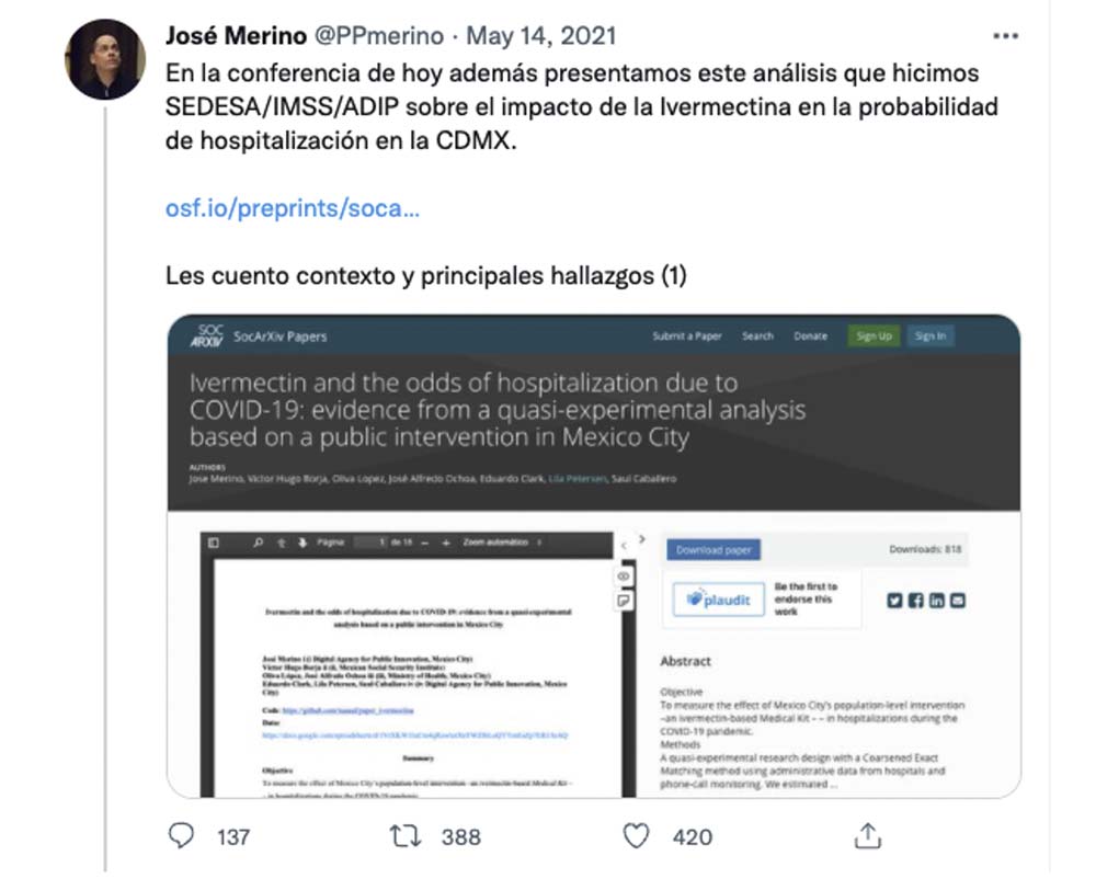 Hacia comienzos de 2021, la evidencia de la ineficacia de la ivermectina para el tratamiento del covid-19 era cada vez más clara entre la comunidad científica nacional e internacional (véase también aquí y aquí). Las críticas siguieron. ¿Cómo habría de justificar el gobierno de la Ciudad de México sus acciones irresponsables? De forma preocupante, las autoridades del gobierno de la ciudad defendieron la entrega de los kits usando un análisis propio que, según los autores, mostraba la eficacia de la ivermectina en reducir hospitalizaciones. En mayo de 2021 el jefe de la Agencia Digital de Innovación Pública, José Merino, presentó un pequeño artículo, firmado por él y por otros funcionarios, como evidencia contundente apoyando las acciones del gobierno capitalino. (El estudio fue publicado en la página SocArXiv, una plataforma que permite a científicos sociales compartir artículos que no han sido corroborados —peer-reviewed— por colegas; hasta la fecha, el artículo no ha sido publicado en una revista arbitrada de prestigio, lo cual es extraño dado el resultado que reportan. Tras discusión del consejo directivo de SocArXiv a raíz de mi crítica en Twitter, el artículo fué retirado de la página el día 4 de febrero de 2022).