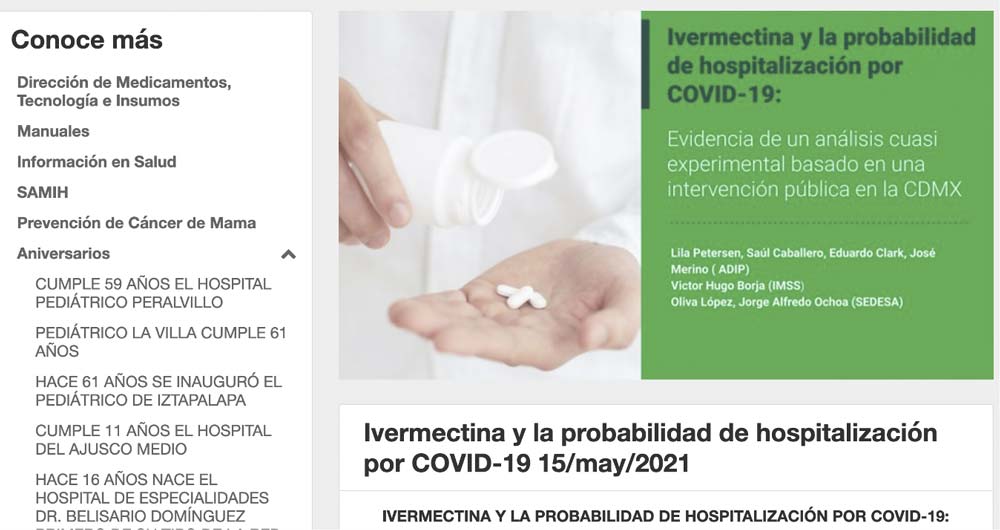 Queda poco claro por qué José Merino —el jefe de una dependencia cuyas atribuciones son supervisar y coordinar políticas de gestión de datos y la infraestructura del gobierno de la Ciudad de México— se volvió el centro de la conversación sobre políticas de salud en la capital (aunque sabemos por sus redes sociales que ha sido, desde hace tiempo, un defensor de la ivermectina). Posiblemente se deriva de su liderazgo en el estudio de 2021 que aparece prominentemente en la página de la Sedesa.