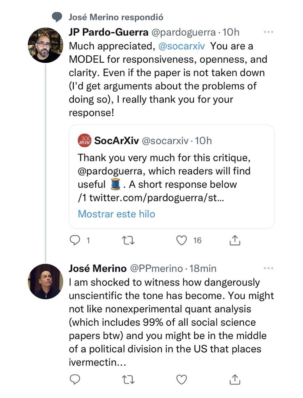 Pero aún más preocupante: valiéndose de la complejidad de las metodologías estadísticas y del desconocimiento de éstas entre el público general, el artículo se presenta como una contribución científica robusta, tanto así que es la única evidencia que ofrece la Sedesa en su página. En respuesta a un petición para retirar el artículo de la página de SocArXiv, por ejemplo, Merino denunció dicha acción como “anticientífica” y “anti-cuantitativa”, añadiendo que respondía a discusiones políticas sobre la ivermectina que no conciernen a la población capitalina.