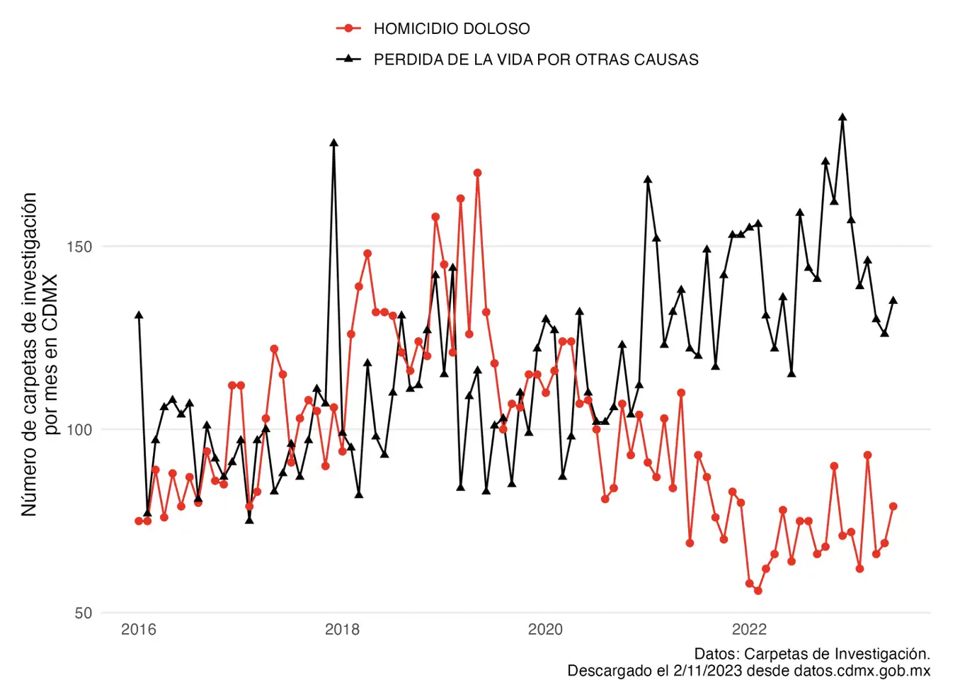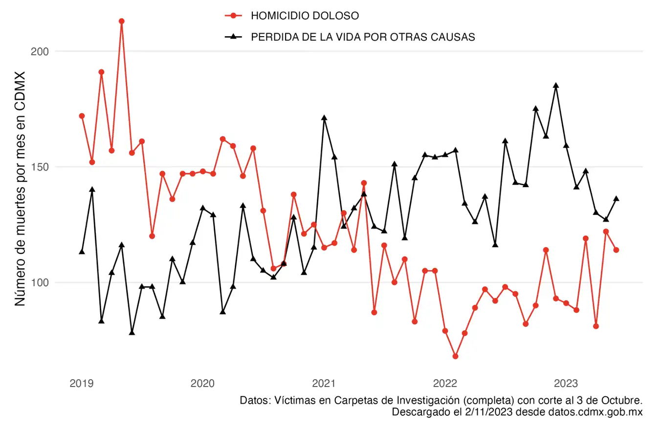El pasado 7 de noviembre, Vanessa Romero y Carlos Pérez Ricart publicaron un texto en el que pretenden “refutar” la “sugerencia” que “algunos periodistas y analistas” han elaborado sobre la posibilidad de que el Gobierno de la Ciudad de México “oculta” o “maquilla” las cifras de homicidios. Esta “sugerencia” resulta de un hecho innegable: a partir del primer año de gestión de Claudia Sheinbaum como jefa de Gobierno de la Ciudad de México los números de homicidios han disminuido mientras que, de forma paralela, el número de muertes registradas por “otras causas” ha incrementado.1 La siguiente gráfica muestra esta tendencia:2