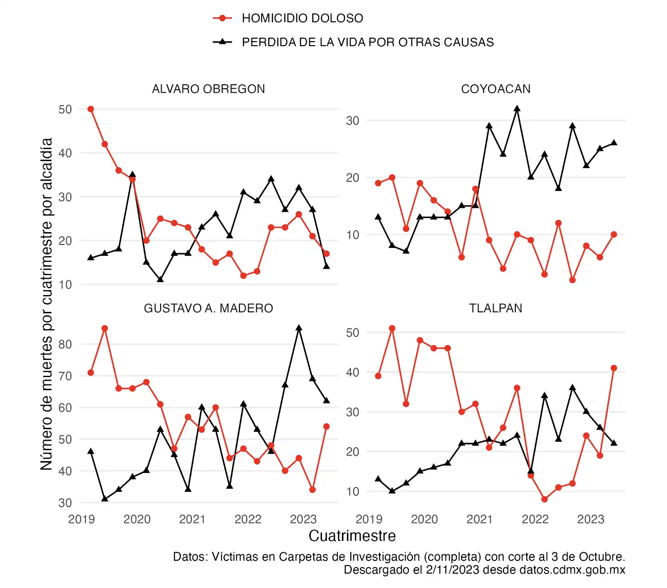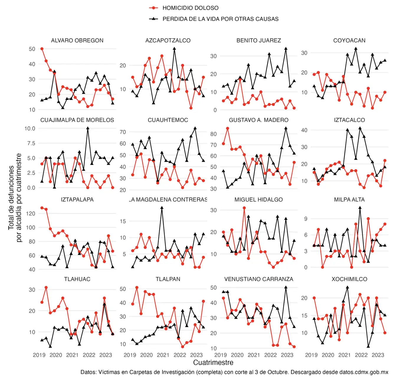 Romero y Pérez Ricart apuntan a una hipótesis que le adjudica responsabilidad a la FGJ y al Incifo y que, al menos de forma indirecta, exime al gobierno de la ciudad de manipular cifras. Puede ser. Sin embargo, las gráficas anteriores producen muchas más preguntas que respuestas. ¿Qué está detrás de tendencias tan distintas según la alcaldía que se trate? ¿Por qué, de las cuatro alcaldías con mayor incidencia de homicidios, en dos se tiene que, desde la actual administración, los homicidios disminuyen a medida que incrementan las muertes por otras causas y en una la reducción en el número de homicidios se acompaña por una tendencia errática en el número de muertes por otras causas? ¿Qué nos dice que cuatro alcaldías (Iztapalapa, Cuauhtémoc, Gustavo A. Madero y Álvaro Obregón) sean las que tienen más homicidios y muertes “por otras causas”?