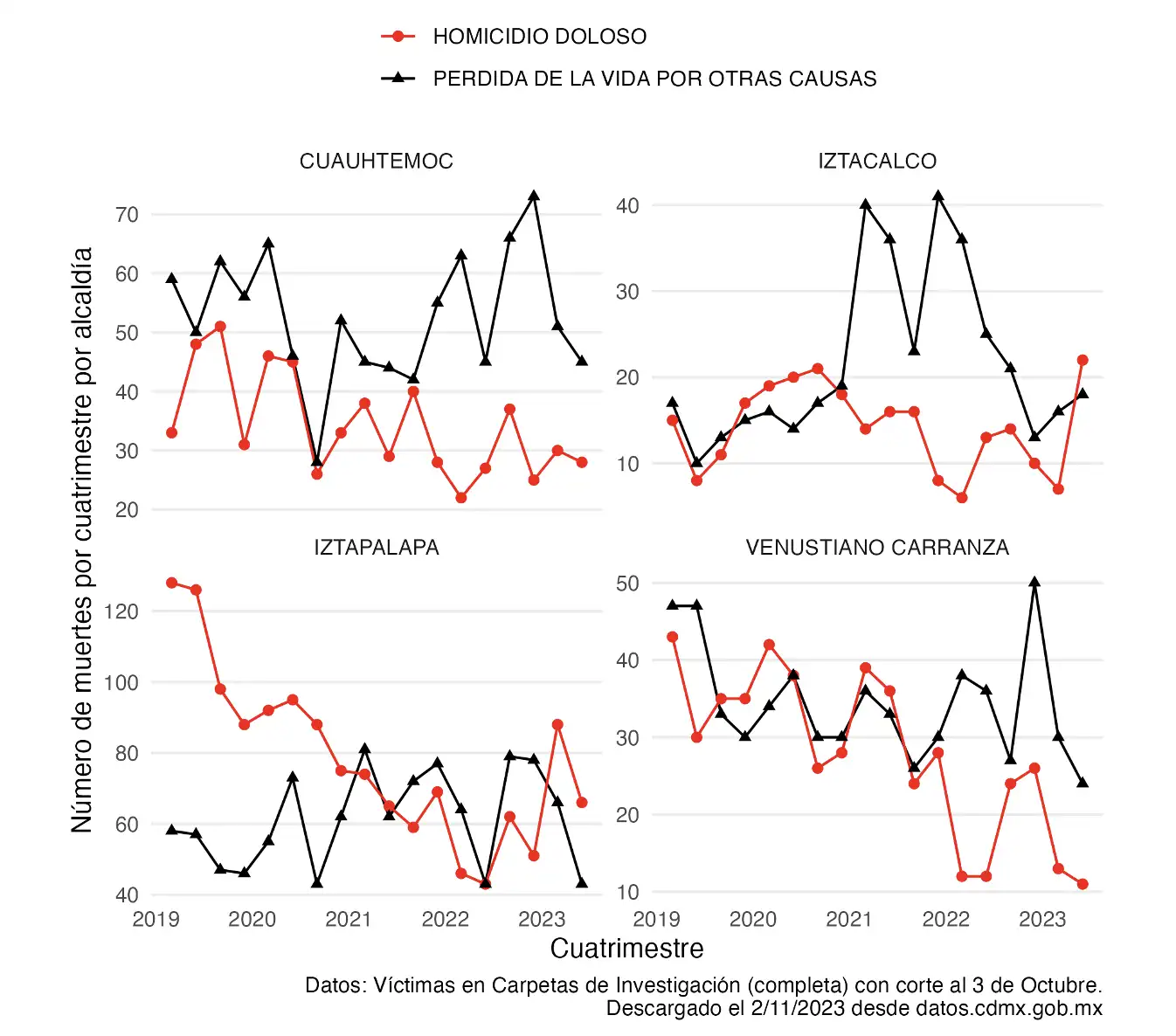 Ahora bien, Romero y Pérez Ricart, junto con otros analistas y comentaristas, basan sus hipótesis en estadísticas agregadas de la CDMX. Esto produce un análisis deficiente, en tanto que la incidencia de homicidios en la ciudad varía entre alcaldías. Por ejemplo, en 2022, cuatro alcaldías concentraron casi 54 % del total de víctimas por homicidios y son estas mismas alcaldías las que registraron el mayor número de víctimas de “muerte por otras causas” —49.3 % del total en CDMX.