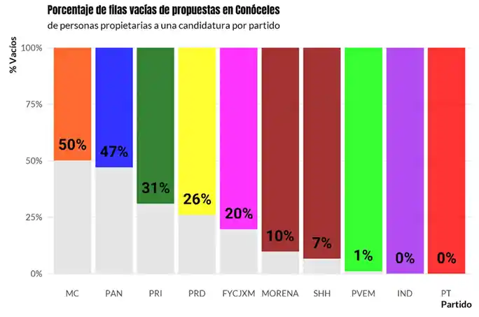 La mitad de las personas que compiten en la elección federal por Movimiento Ciudadano y por Acción Nacional no registraron ninguna propuesta. Simplemente dejaron el espacio en blanco. Le sigue una tercera parte del PRI y del PRD, una quinta parte de Fuerza y Corazón por México y una décima parte de Morena y Sigamos Haciendo Historia.