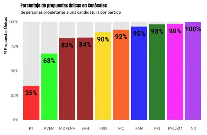 Dejando a las personas candidatas incumplidas atrás, queda espacio para estudiar aquellas que más que incumplidas deciden adoptar la postura del partido. El PT es un caso excepcional, porque la mayoría de sus personas candidatas llenó las mismas propuestas. Este análisis no es exhaustivo y no se detiene a calcular las similitudes con alguna métrica en particular, por lo que la estrategia fue encontrar propuestas exactamente iguales. El resultado es que 65% de las propuestas del Partido del Trabajo son copias exactas de otras. Esta tendencia se repite en menor medida con las propuestas del Partido Verde, en la que 32% de sus candidaturas optaron por esta opción.